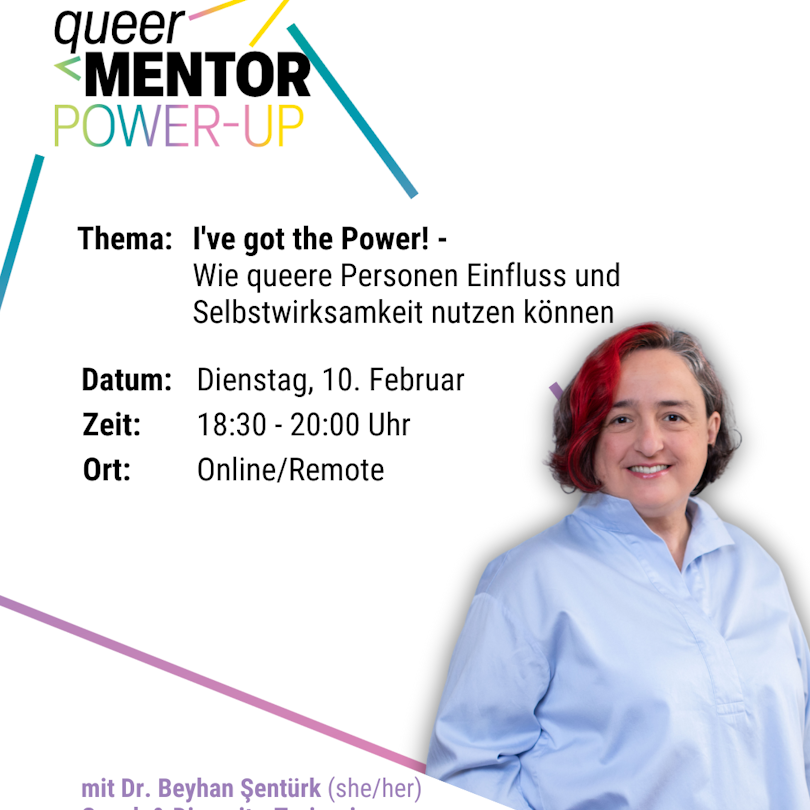 Im diesmonatigen Queermentor POWER-UP erarbeitet Dr. Beyhan Şentürk mit uns Strategien für mehr Selbstwirksamkeit. Außerdem sprechen wir über Machtcodes und warum es sinnvoll ist, sie zu erkennen.